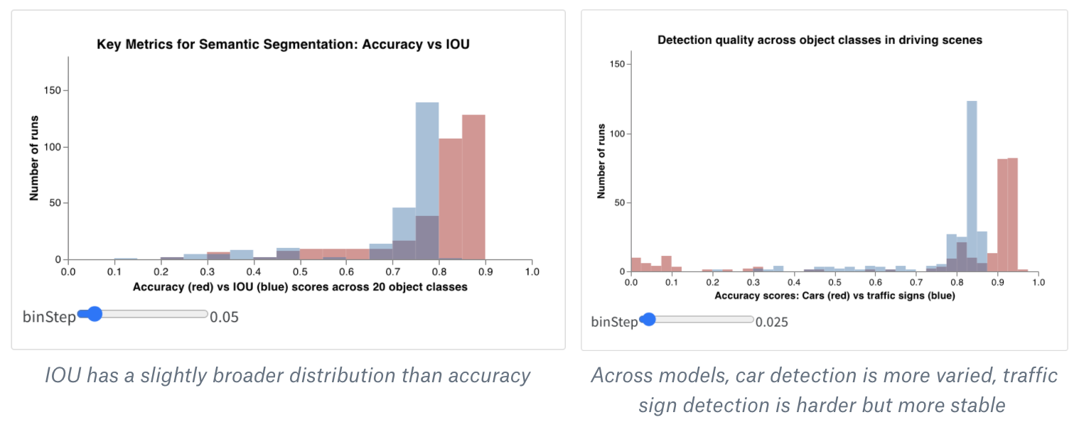 ヒストグラムは数値分布を可視化し、より大きなデータセットを理解するのに役立ちます。合成ヒストグラムは、同じビンに複数の分布を表示し、異なるモデルまたはモデル内の異なるクラス間で二つ以上のメトリクスを比較することができます。セマンティックセグメンテーションモデルで自動車の走行シーンのオブジェクトを検出する場合、精度と Intersection over union (IoU) の最適化の有効性を比較することができます。また、異なるモデルが車 (データ中の大きく一般的な領域) と交通標識 (非常に小さく一般的でない領域) をどれだけうまく検出するかを知りたい場合もあります。デモの Colab では、十分類のうちの二つのカテゴリの信頼スコアを比較できます。