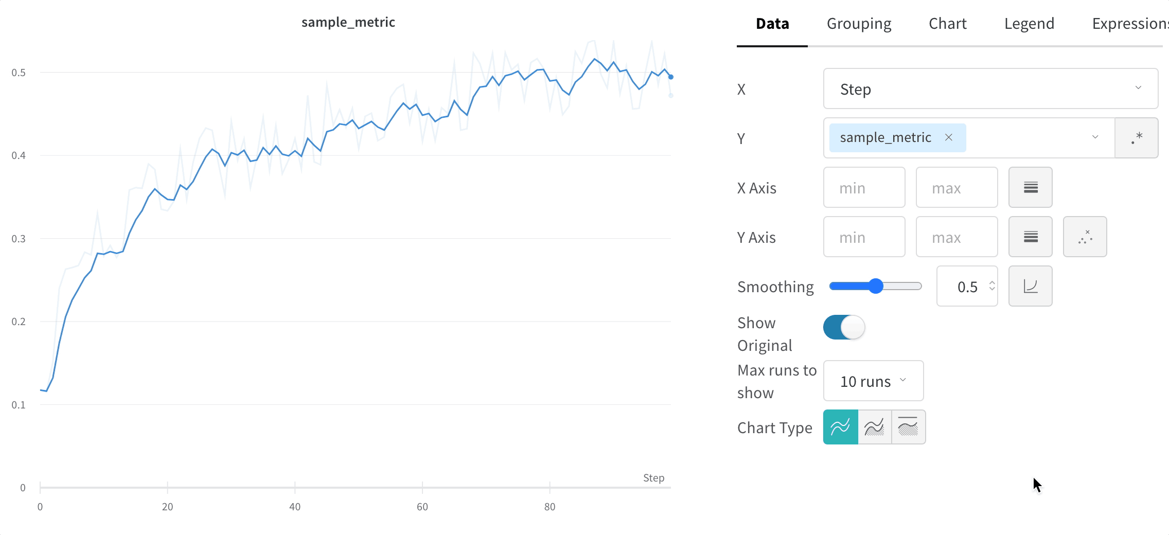 デフォルトでは、元の平滑化されていないデータを背景の淡い線として表示します。Show Original トグルをクリックしてこれをオフにします。
