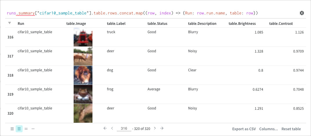 runsis a variable automatically injected in Query Panel Expressions when the Query Panel is in a Workspace. Its "value" is the list of runs which are visible for that particular Workspace. Read about the different attributes available within a run here.summaryis an op which returns the Summary object for a Run. Note: ops are "mapped", meaning this op is applied to each Run in the list, resulting in a list of Summary objects.["cifar10_sample_table"]is a Pick op (denoted with brackets), with a parameter of "predictions". Since Summary objects act like dictionaries or maps, this operation "picks" the "predictions" field off of each Summary object.