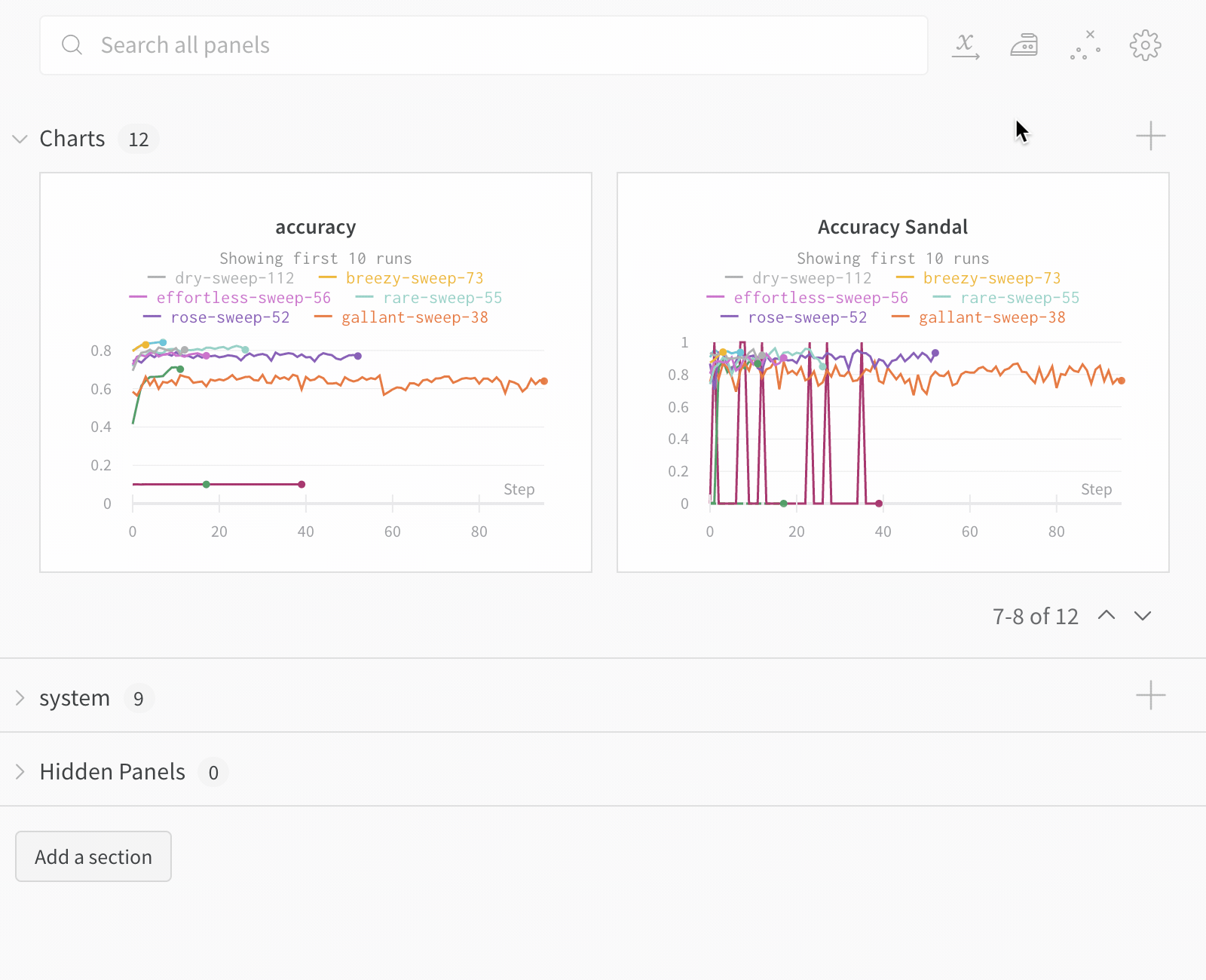 パネルレイアウト: 結果を探索し、チャートを追加・削除し、異なるメトリクスに基づいてモデルのバージョンを比較するための作業スペース