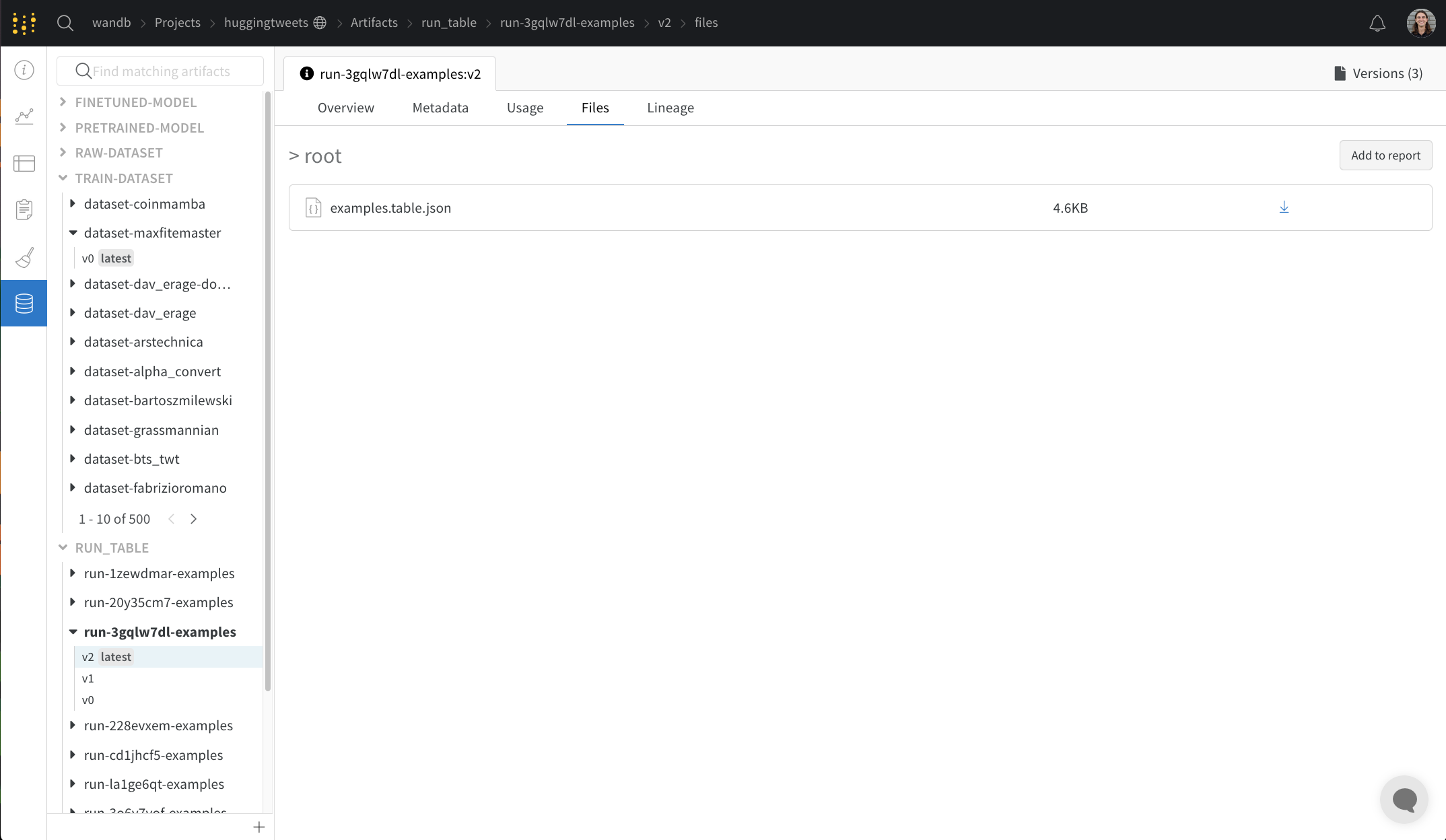 トレーニングデータセットやファインチューン済みモデル、メトリクスやメディアのテーブルからプロジェクトに関連するすべてのartifactsを表示します。