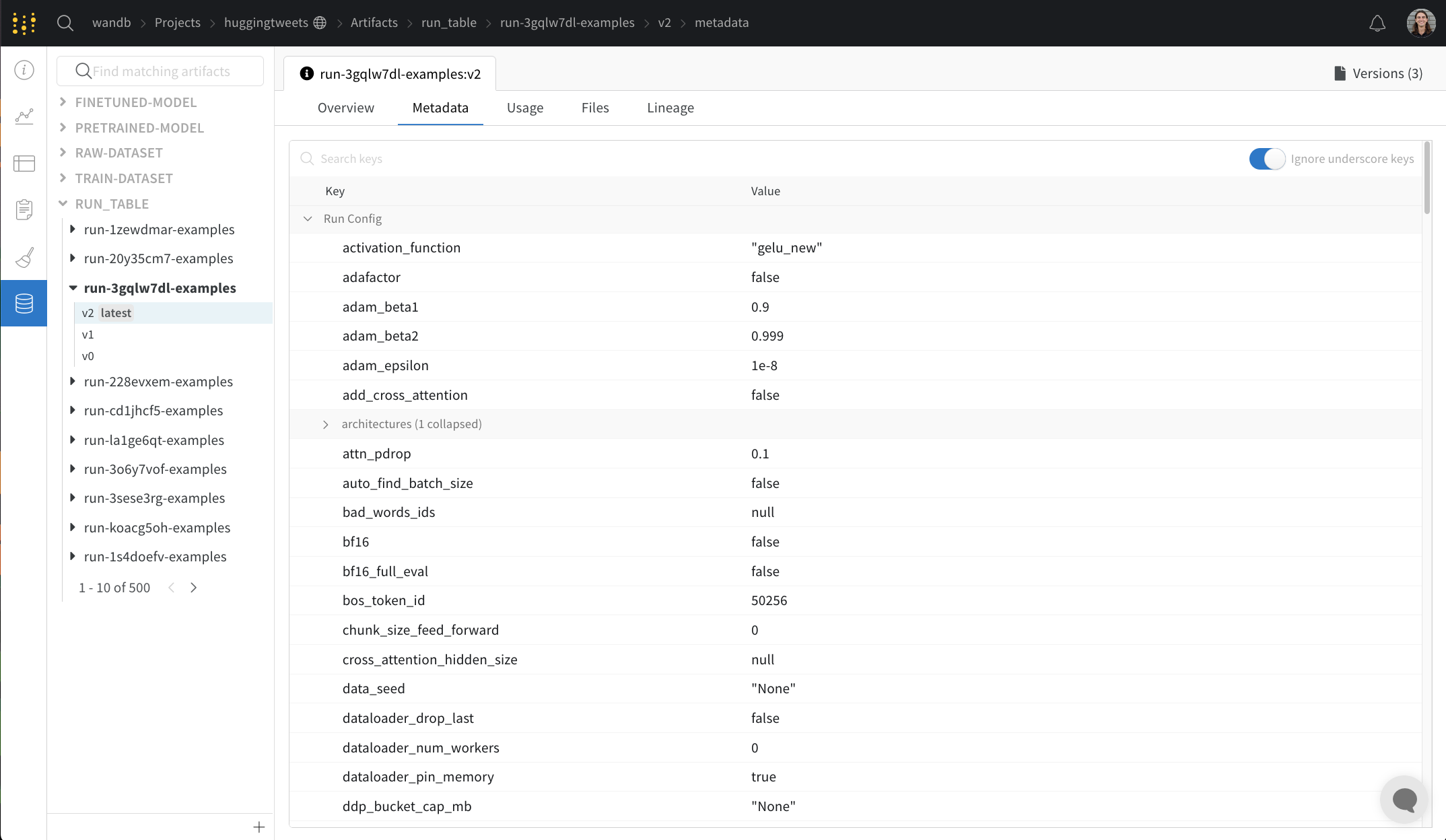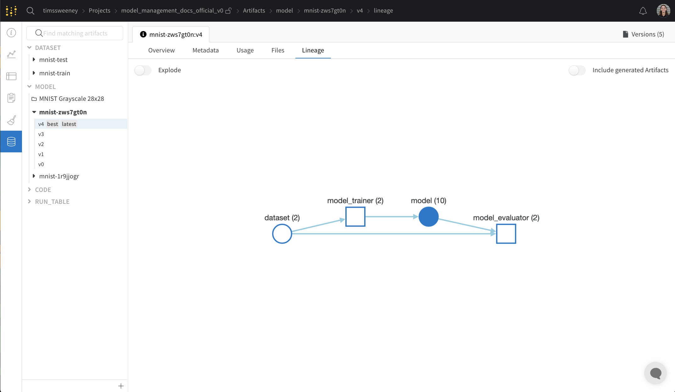 Explodeトグルをクリックすると、個別のアーティファクトバージョンとそれらを接続する特定のrunが表示されます。