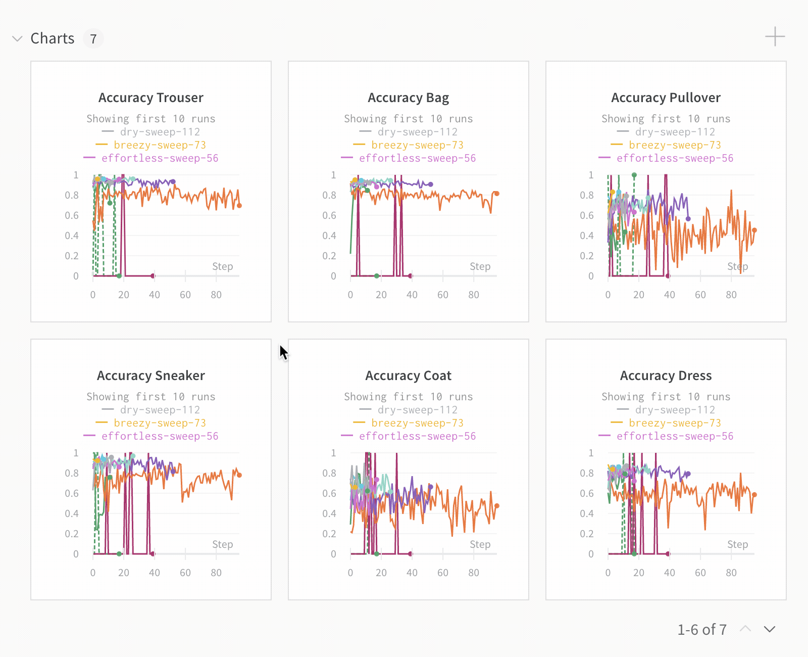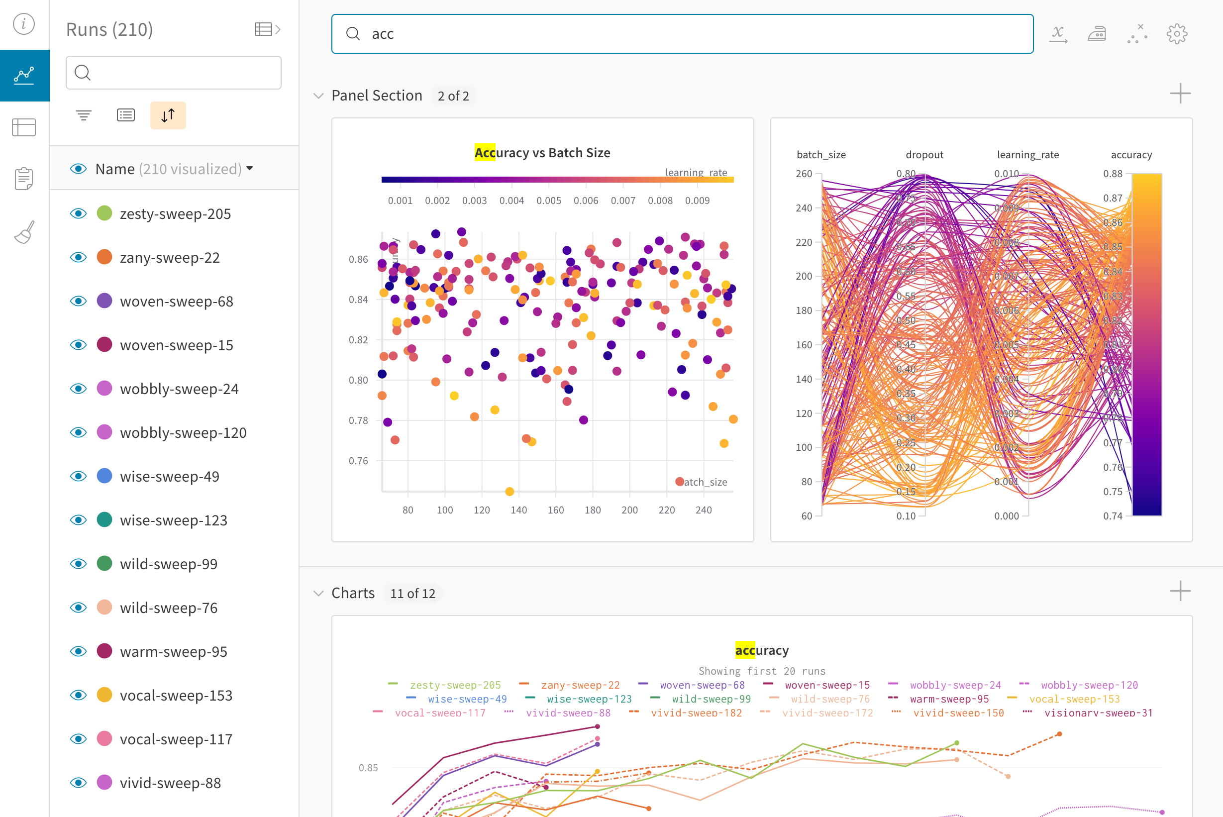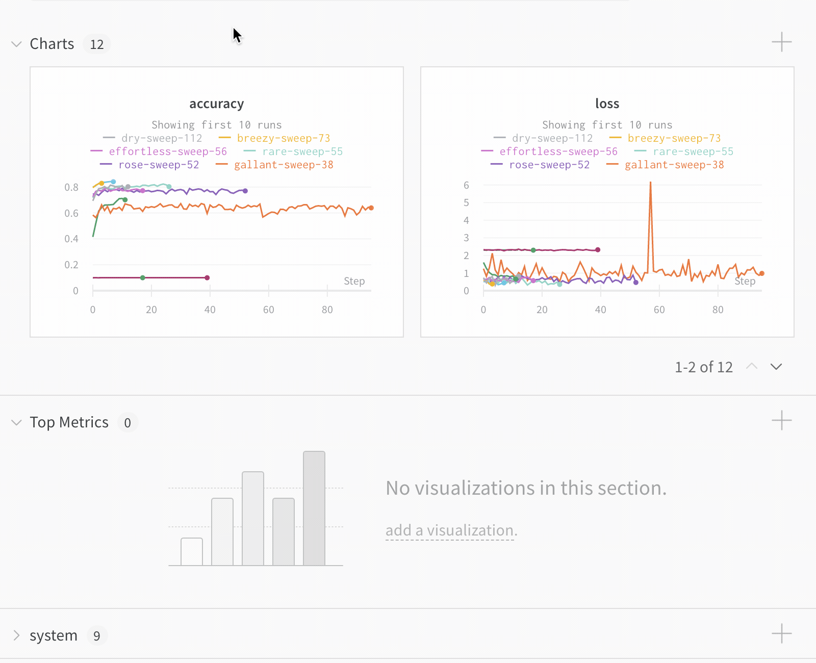 - ソート: 最小の損失や最大の精度など、runをソートする値を選択。ソートにより、グラフに表示されるrunが変わります。
