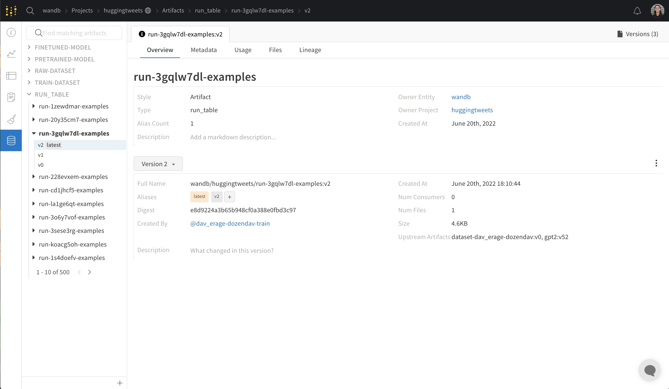 概要パネルでは、アーティファクトの名前とバージョン、変更を検出し重複を防ぐためのハッシュダイジェスト、作成日、およびエイリアスなどの高レベルの情報が表示されます。ここでエイリアスの追加や削除、バージョンおよびアーティファクト全体についてのメモの作成ができます。