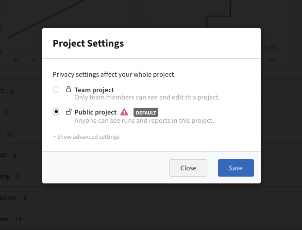 ナビゲーションバーの上部にある鍵アイコンをクリックして、プロジェクトのプライバシー設定を変更します。この設定を使用して、プロジェクトへのrunの閲覧や送信を誰に許可するかを編集できます。これらの設定には、プロジェクト内のすべてのrunとReportsが含まれます。結果を一部の人とだけ共有したい場合は、プライベートチームを作成できます。