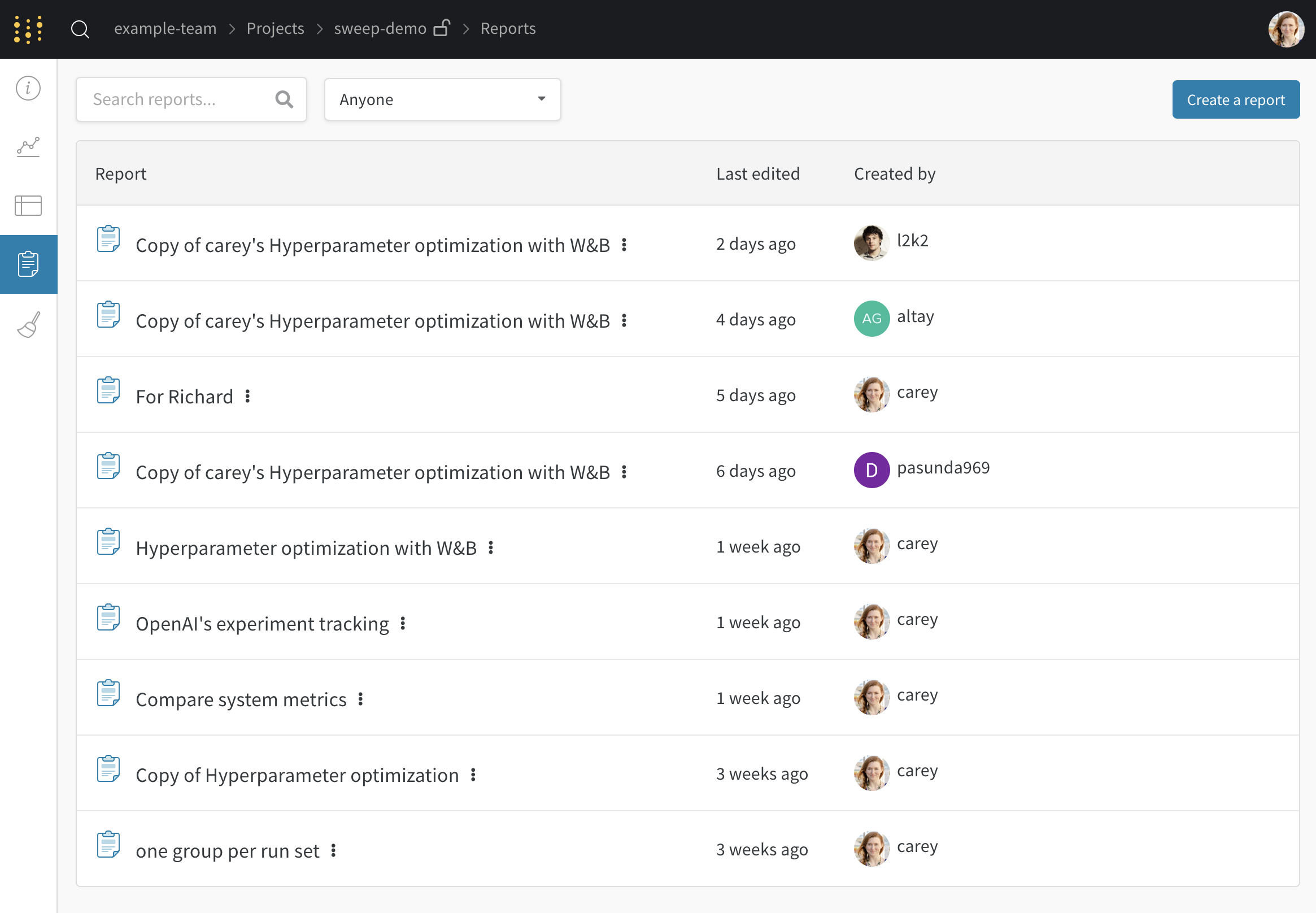 - Reports: メモ、run、グラフの保存されたスナップショット