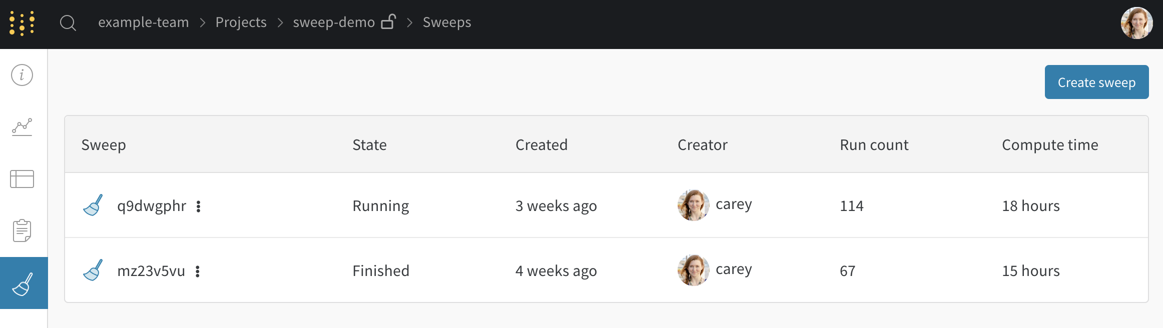 プロジェクトから新しいsweepを開始します。