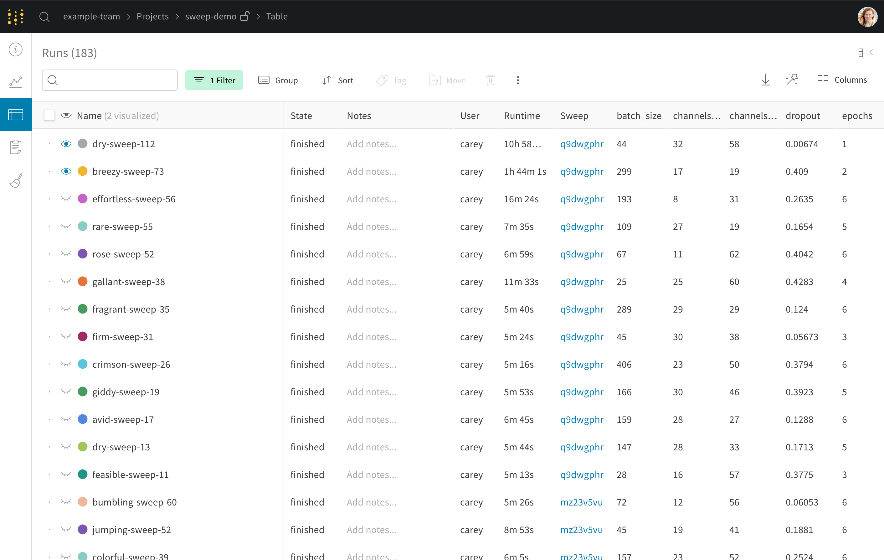 W&B Appを使用して、W&B Tablesをソート、フィルタリング、グループ化します。