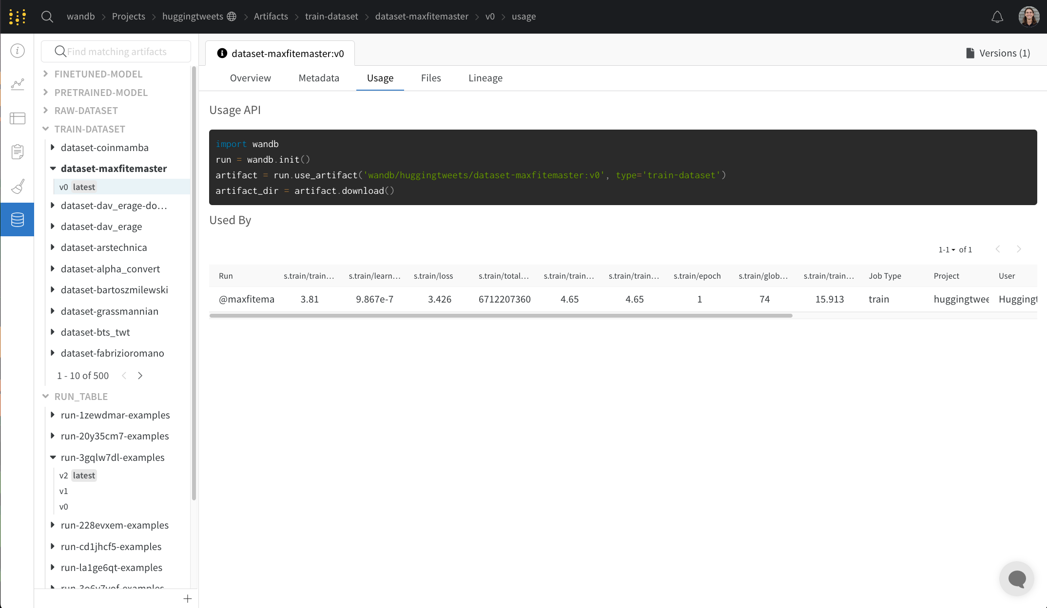 使用パネルでは、アーティファクトをWebアプリ外で使用するためのコードスニペットが提供されます。たとえば、ローカルマシンで使用する場合です。このセクションにはアーティファクトを出力したrunやアーティファクトを入力として使用したrunもリンクとともに表示されます。