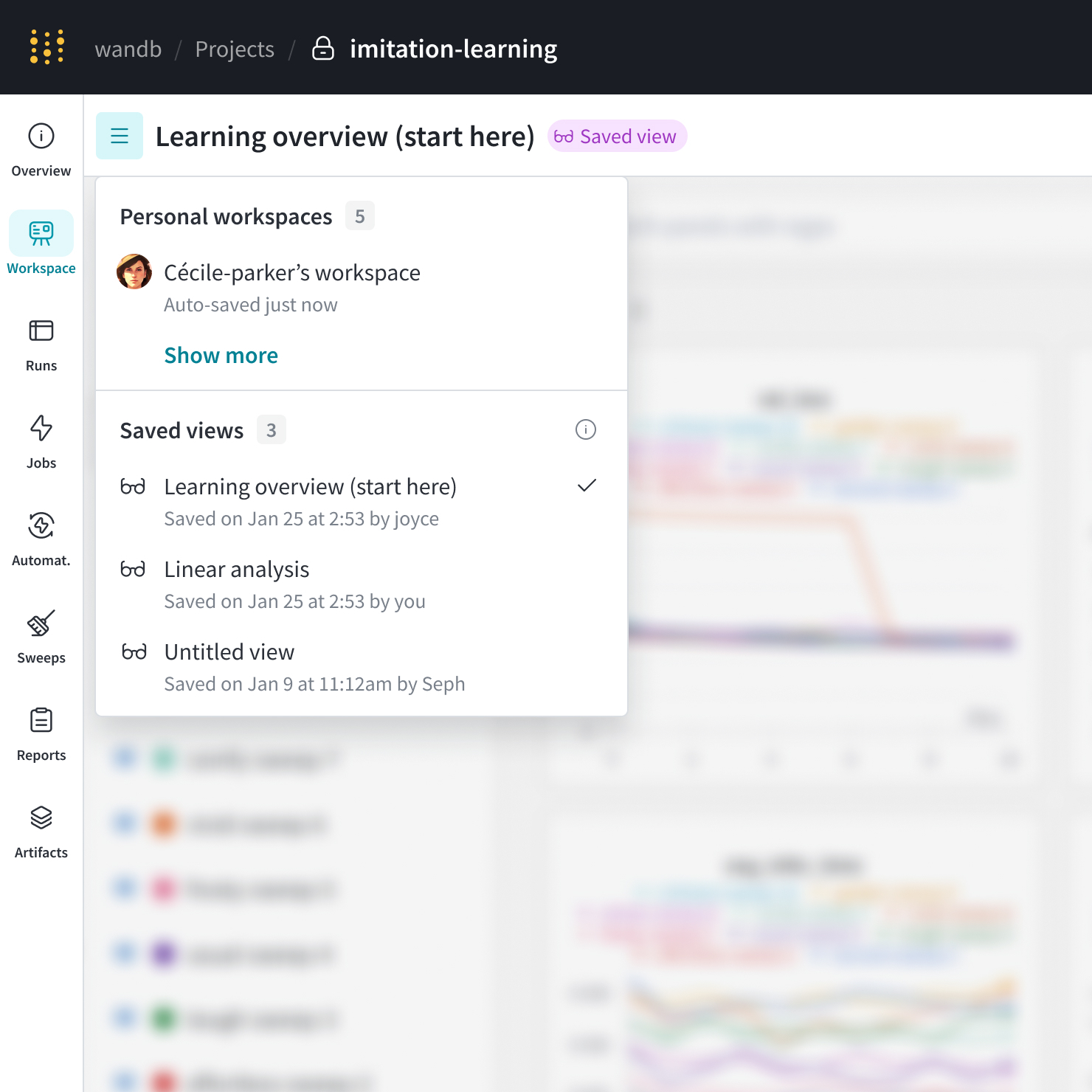 • Saved views: ワークスペースの共同スナップショットです。チームの誰もが、保存されたワークスペースビューを閲覧、編集、および変更を保存できます。保存されたワークスペースビューを使用して、実験、run などをレビューし、議論します。