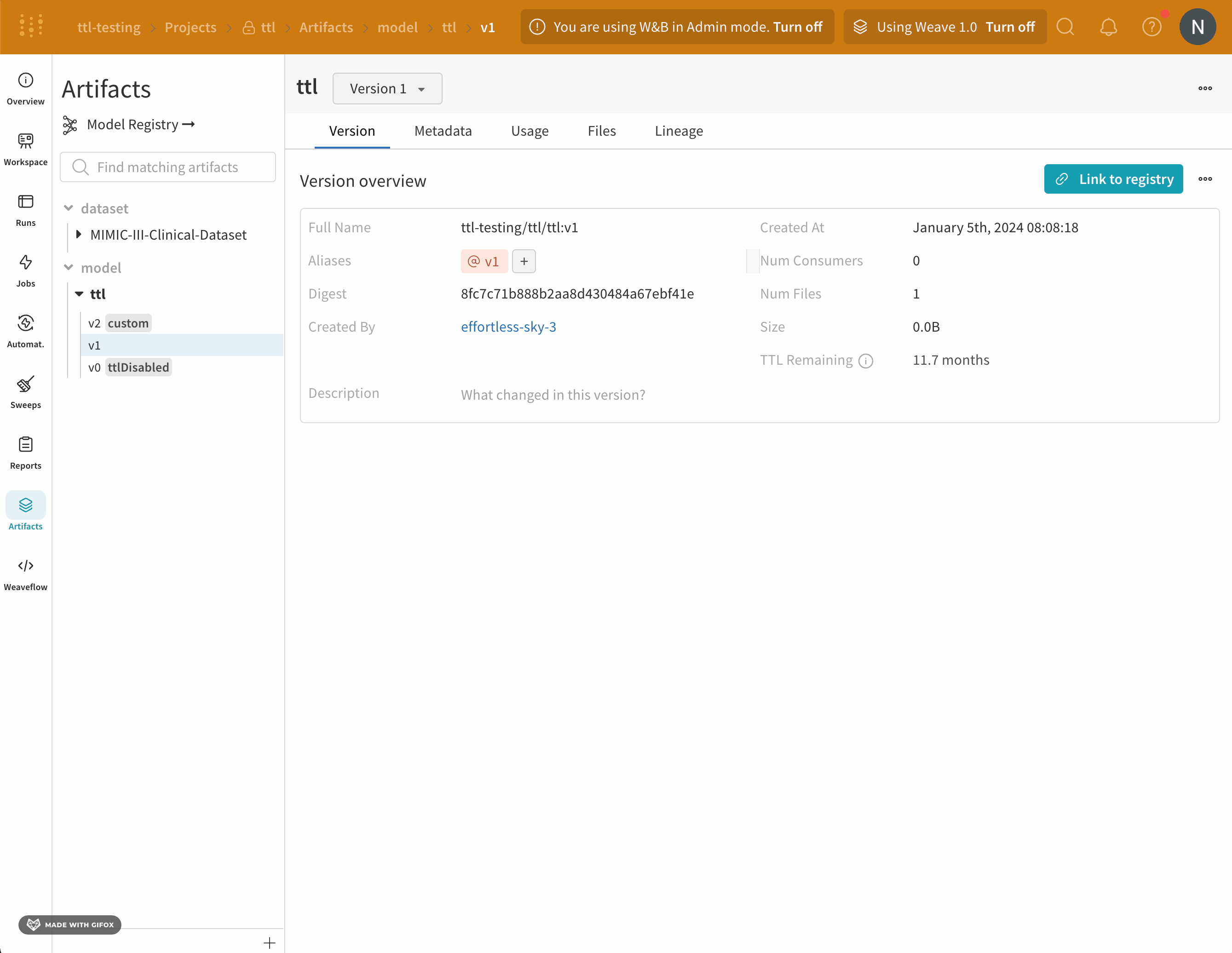 Python SDKまたはW&BアプリのUIを使用して、アーティファクトのTTLポリシーを表示します。