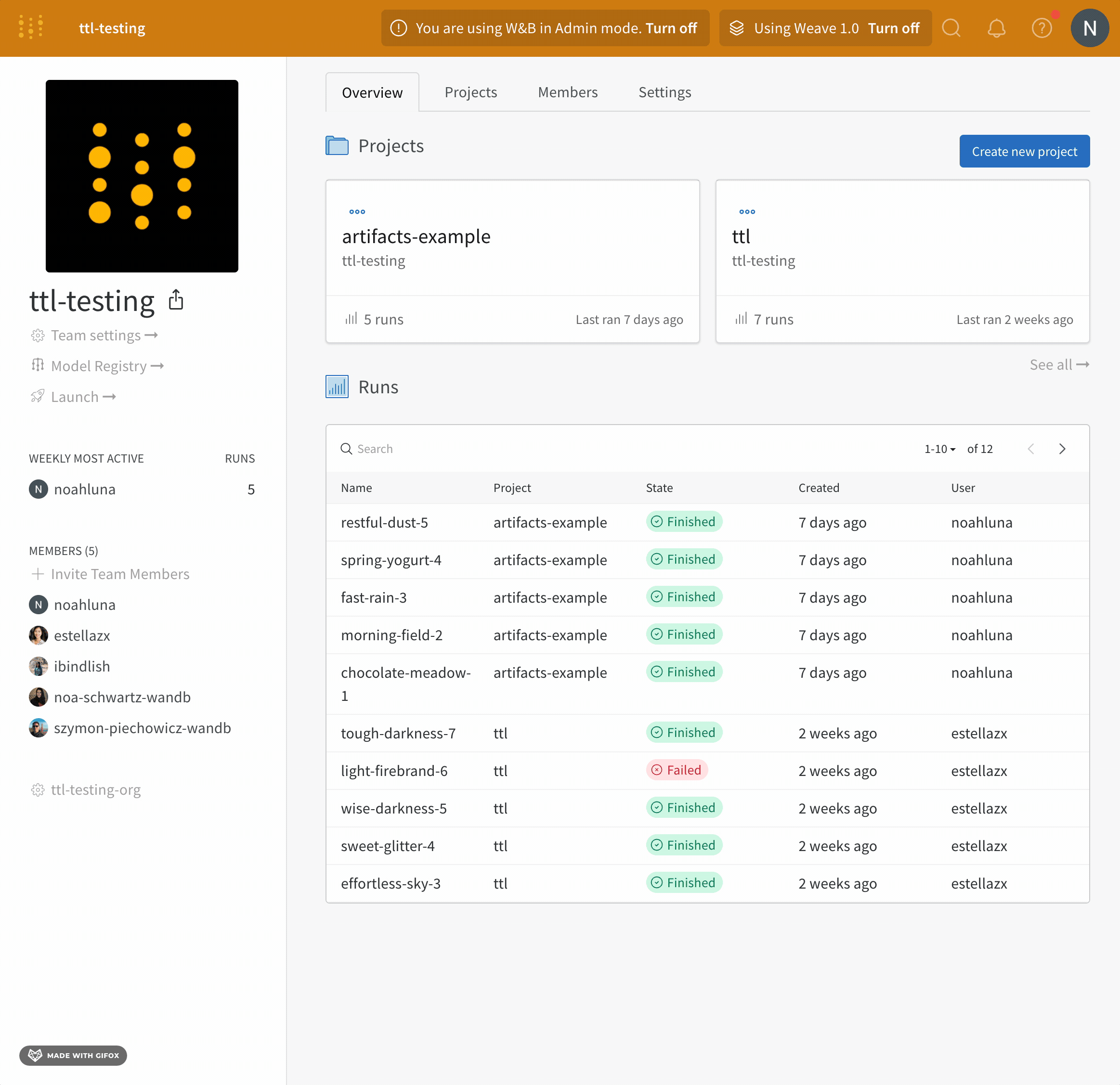 • W&BアプリのUIでTTLポリシーを設定または編集するオプションがアーティファクトの詳細に表示されない場合、またはプログラムでTTLを設定してもアーティファクトのTTLプロパティが正常に変更されない場合は、チーム管理者が権限を付与していない可能性があります。