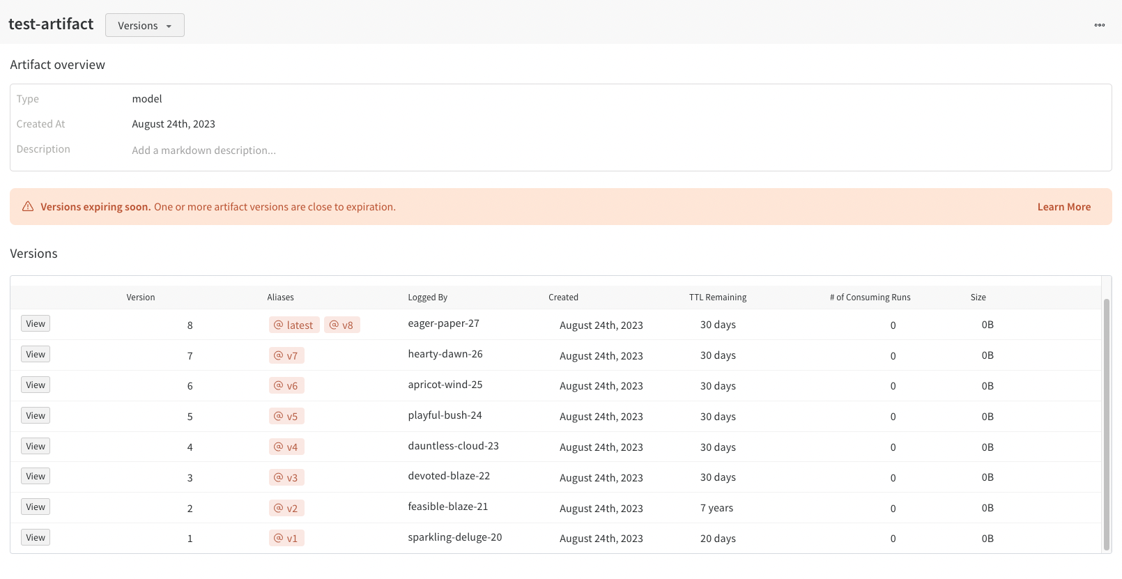 前述のコードスニペットでは、アーティファクトのTTLポリシーを30日に設定しています。つまり、W&Bは30日後にアーティファクトを削除します。