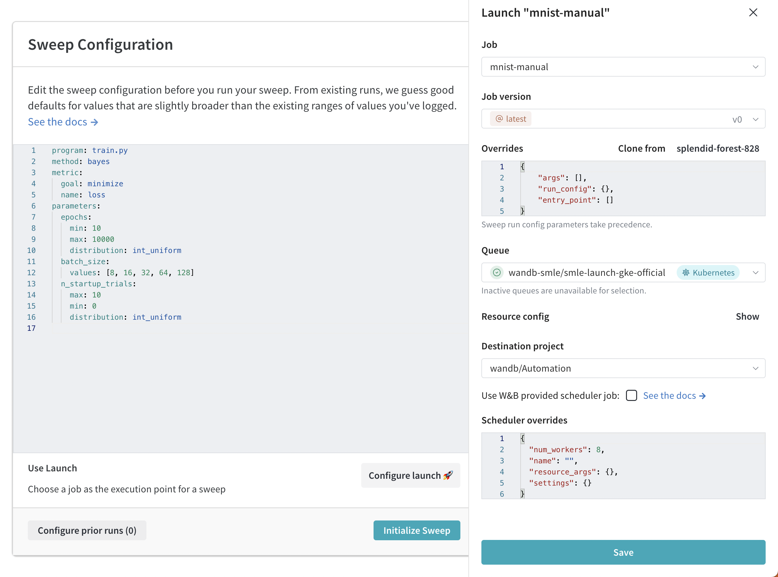 'wandb/sweep-jobs/job-wandb-sweep-scheduler:latest' schedulerブロックとこの名前を指すjobキーを含む設定yamlを作成します(下の例を参照)。- 新しい設定を使って