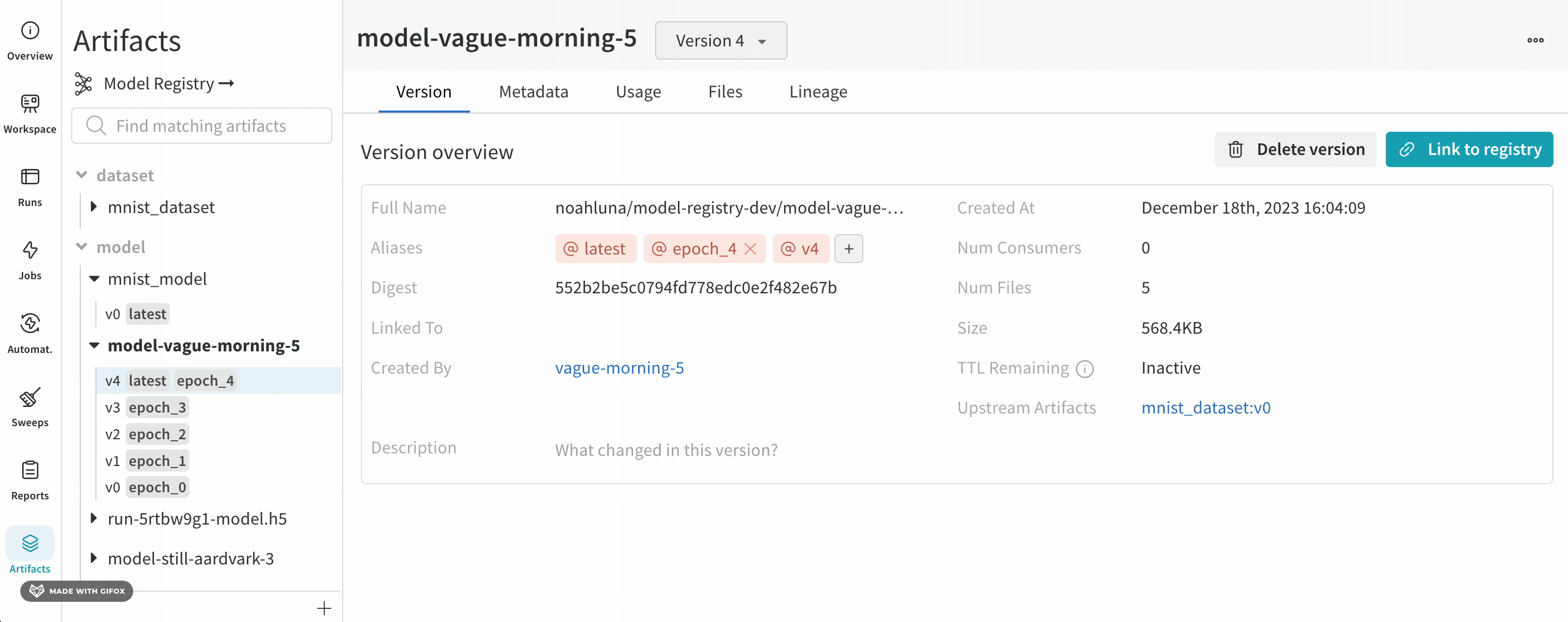 リンクされたモデルのソースを見る方法は2つあります: モデルがログされたプロジェクト内のアーティファクトブラウザとW&B Model Registryです。