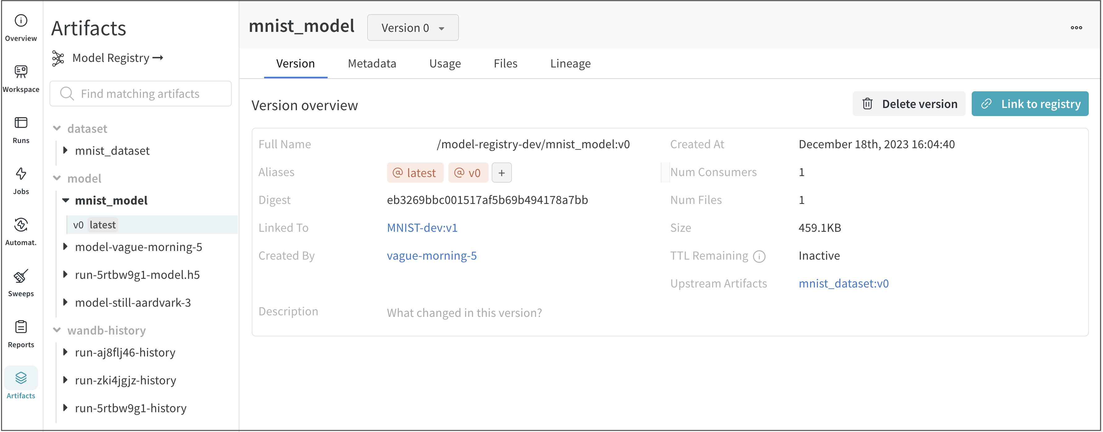例えば、下記画像では v0 モデルバージョンで呼ばれる mnist_model ( Source version フィールド mnist_model:v0 を参照) が、 MNIST-dev という登録モデルにリンクされています。