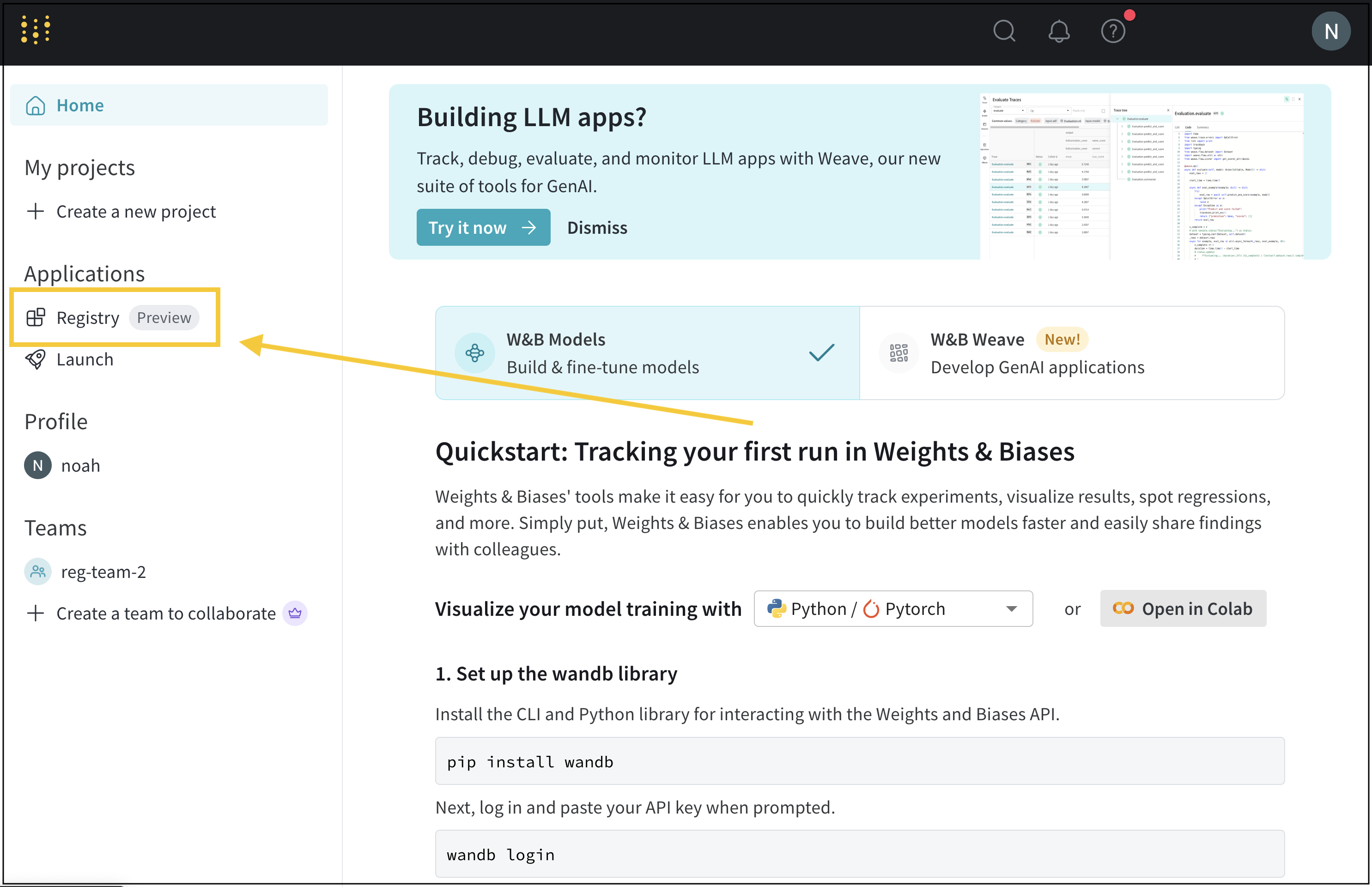 - W&B App 上のプロジェクトのアーティファクトブラウザーに移動します: