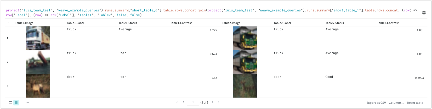 project("luis_team_test", "weave_example_queries").runs.summary["short_table_0"].table.rows.concat는 첫 번째 테이블입니다project("luis_team_test", "weave_example_queries").runs.summary["short_table_1"].table.rows.concat는 두 번째 테이블입니다(row) => row["Label"]은 각 테이블의 선택자로, 조인할 열을 결정합니다"Table1"과"Table2"는 조인될 때 각 테이블의 이름입니다true와false는 왼쪽 및 오른쪽 내부/외부 조인 설정입니다