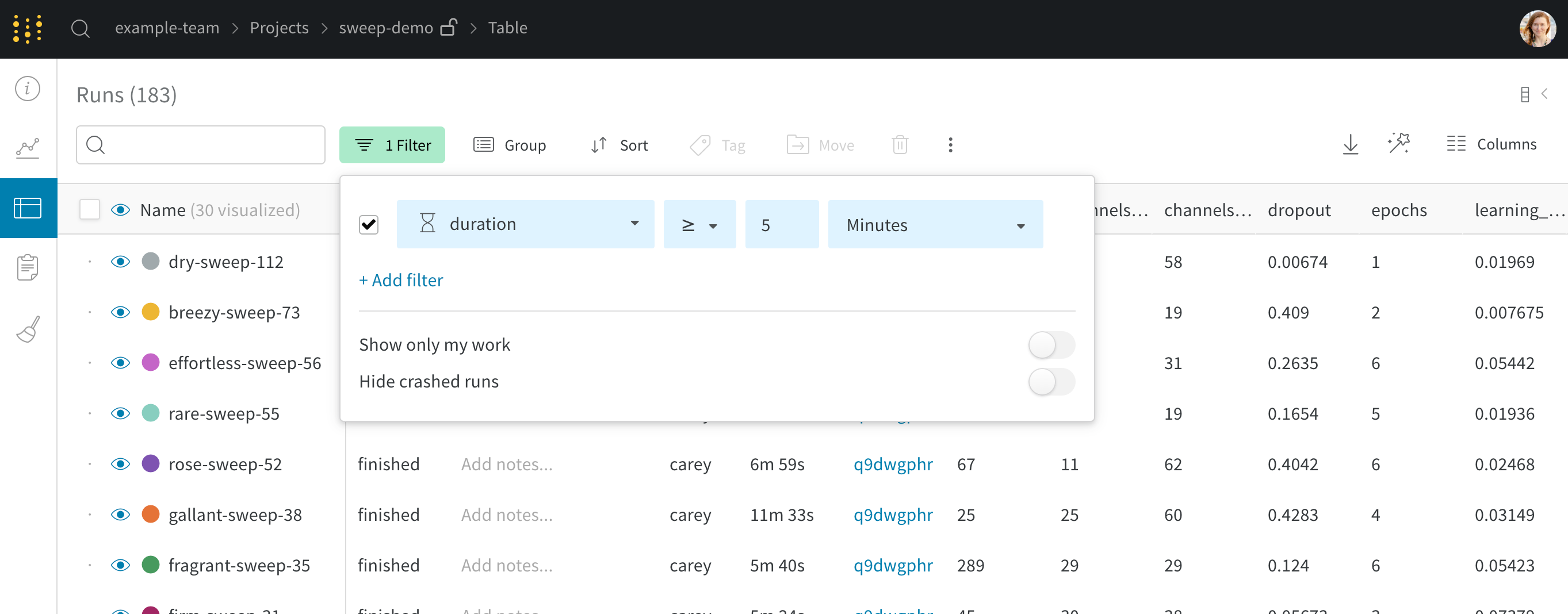 • Hide crashed runs는 테이블에서 추락한 것으로 표시된 run을 필터링합니다