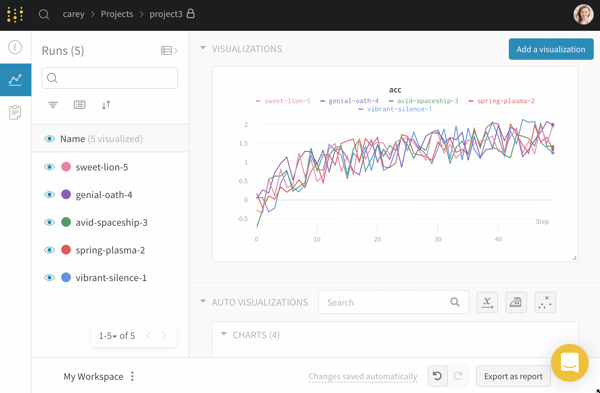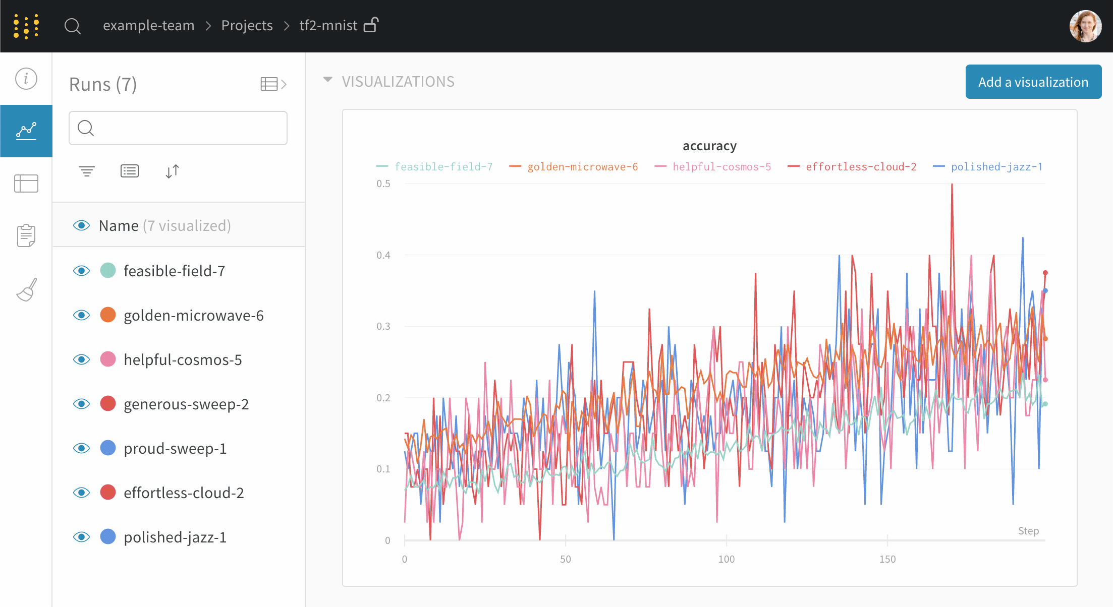 run 이름 옆에 녹색 점이 있는 것을 찾아보세요— 이것은 표와 그래프 범례에서 활성 상태임을 나타냅니다.