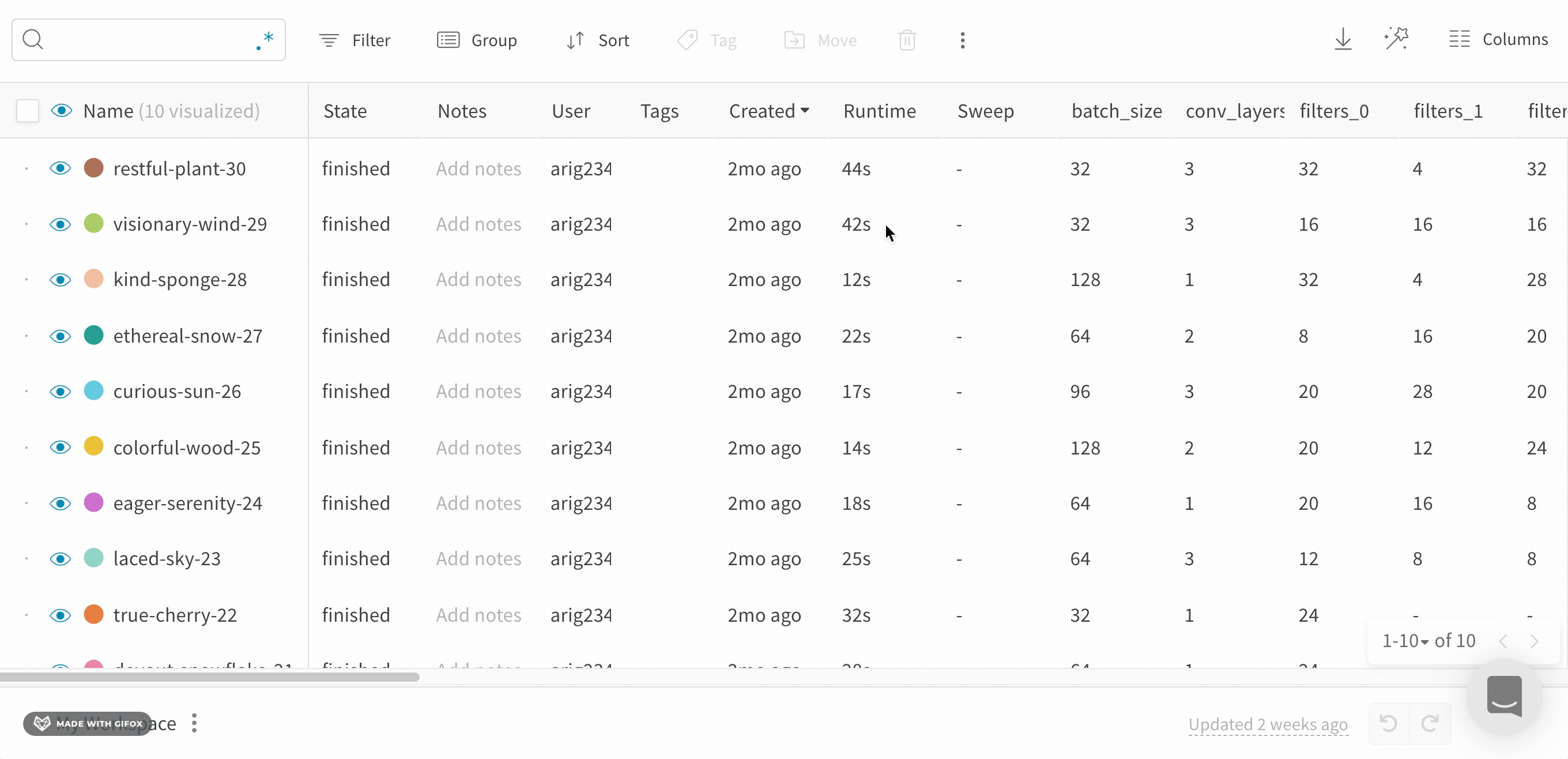 regex가 원하는 결과를 제공하지 않는 경우 tags를 사용하여 Runs Table에서 run들을 필터링할 수 있습니다. 태그는 run 생성 시 또는 완료된 후에 추가할 수 있습니다. run에 태그가 추가되면 아래 gif와 같이 태그 필터를 추가할 수 있습니다.
