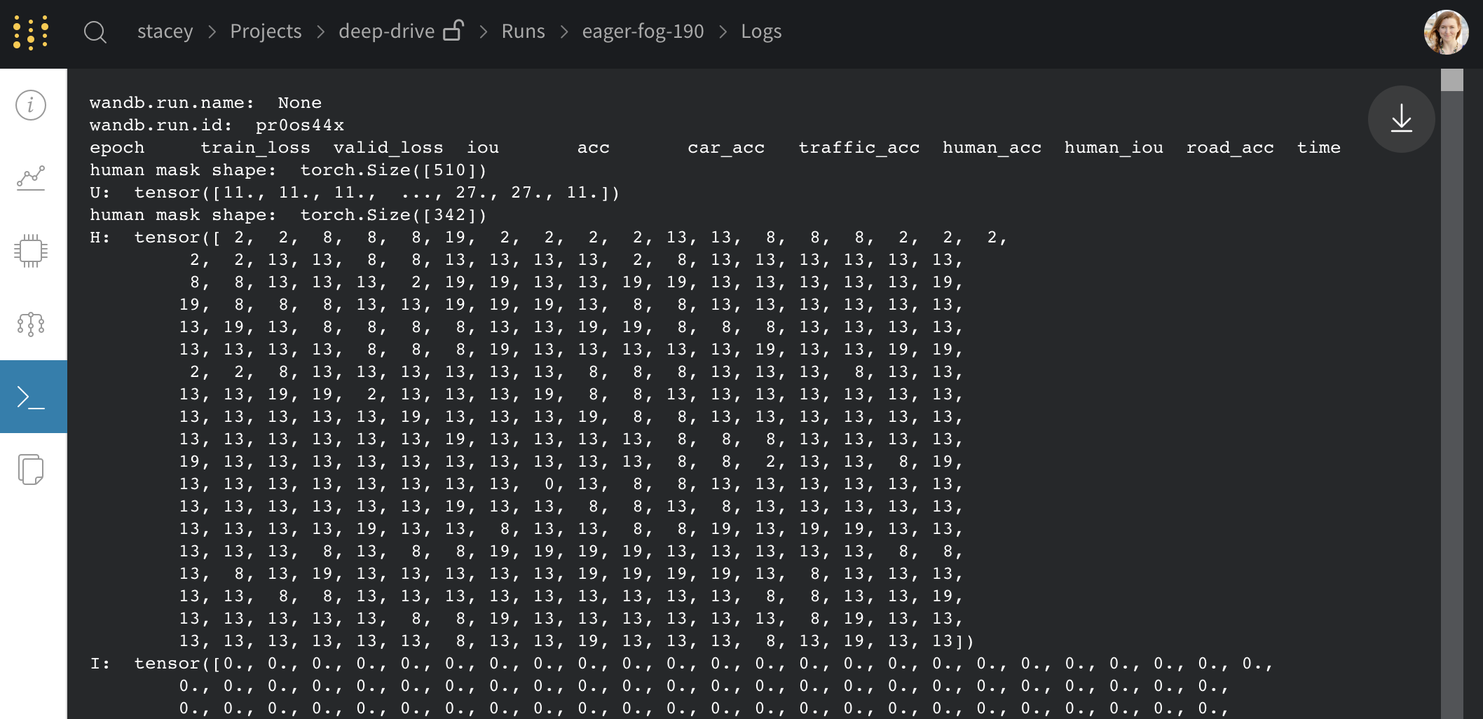 • 마지막 1000줄을 보여줍니다. run이 종료된 후 전체 로그 파일을 다운로드하려면 오른쪽 상단의 다운로드 버튼을 클릭하세요.