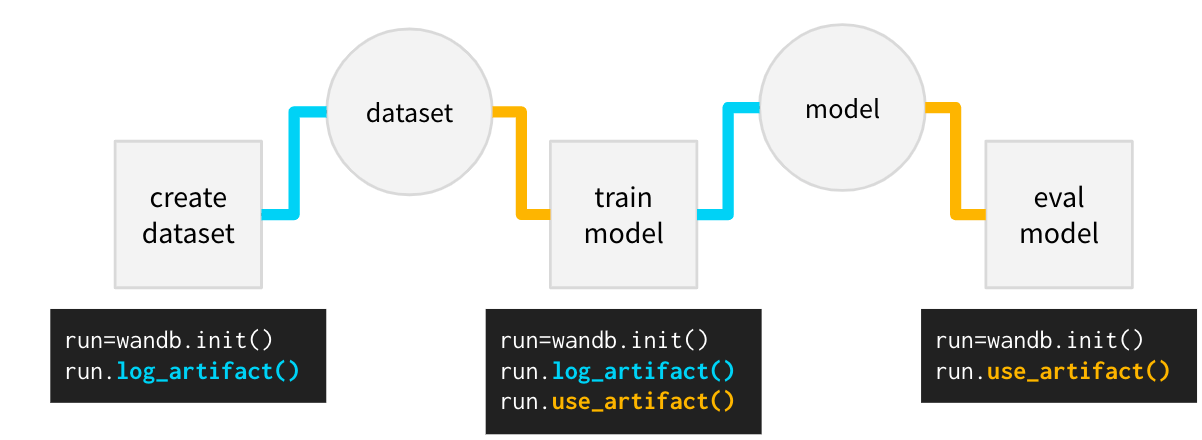위 다이어그램은 runs의 입력 및 출력으로 아티팩트를 사용하여 전체 ML 워크플로우를 어떻게 활용할 수 있는지 보여줍니다.