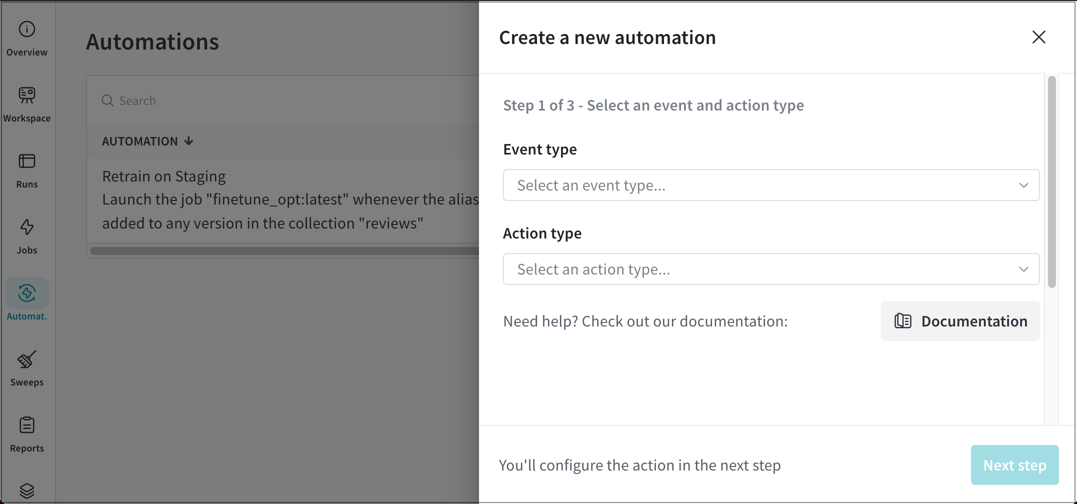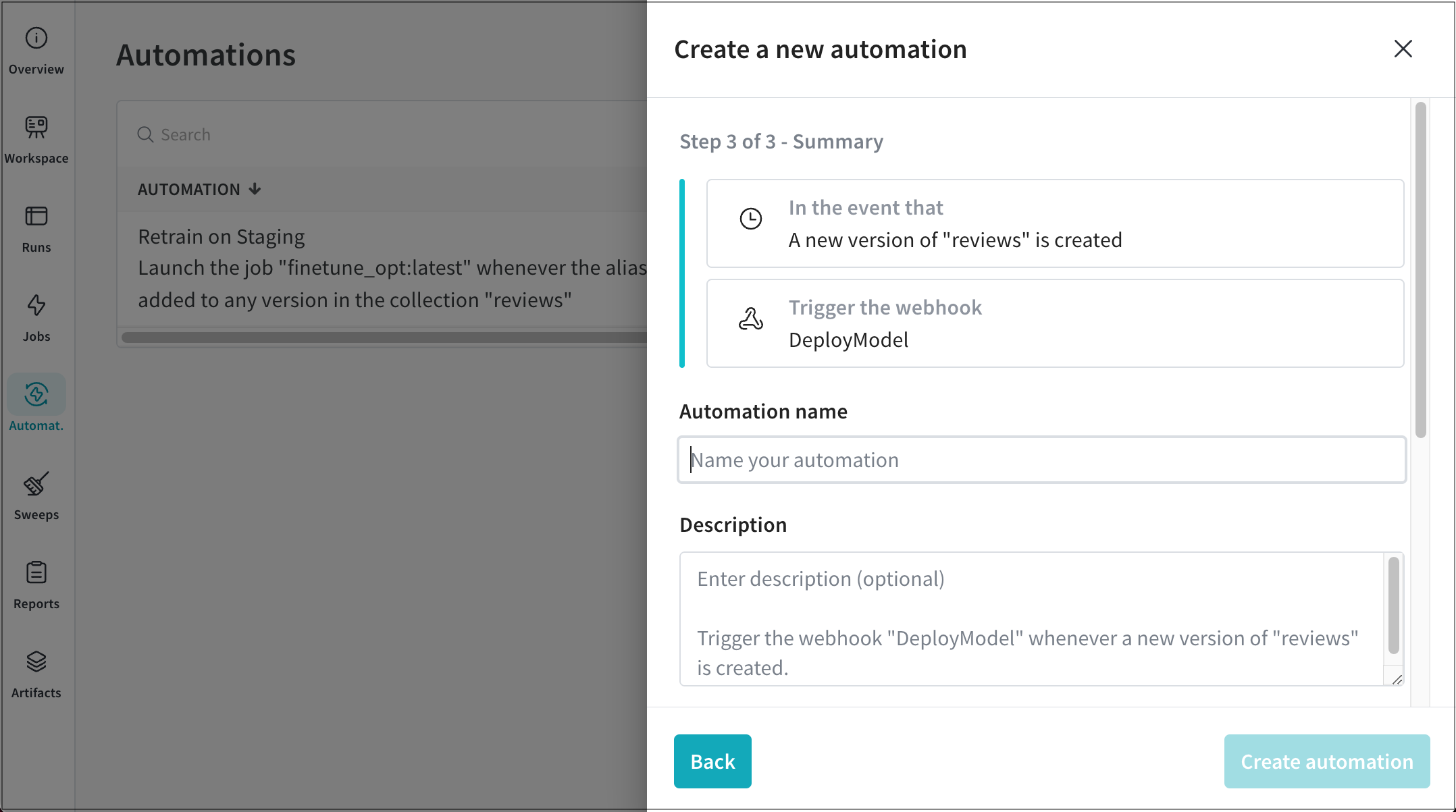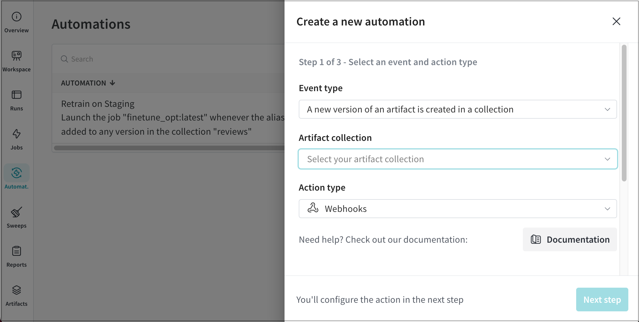 A new version of an artifact is created in a collection 이벤트 유형을 사용하여 아티팩트의 각 버전에 반복적인 작업을 적용합니다. 예를 들어, 새 데이터셋 아티팩트 버전이 생성될 때마다 자동으로 트레이닝 작업을 시작하는 자동화를 생성할 수 있습니다.