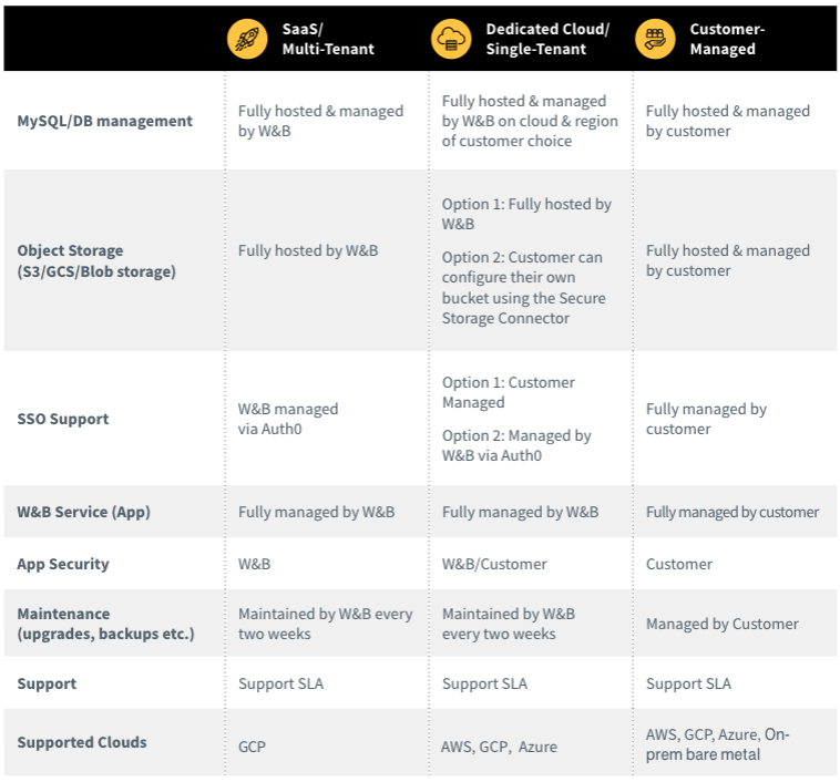 - W&B 관리 전용 클라우드: W&B 클라우드에서 W&B가 호스팅하고 유지 관리하는 완전 관리형 솔루션