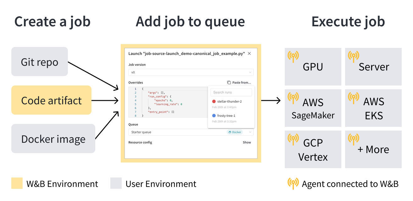 launch job은 ML 워크플로우에서 작업을 구성하고 실행하기 위한 청사진입니다. Launch job이 있으면, 이를 launch 큐에 추가할 수 있습니다. launch 큐는 선입선출(first-in, first-out (FIFO)) 큐로, Amazon SageMaker 또는 Kubernetes 클러스터와 같은 특정 컴퓨트 타깃 리소스에 job을 구성하고 제출할 수 있습니다.
