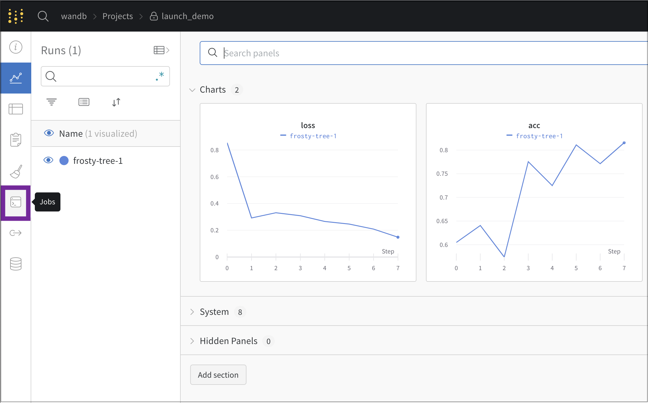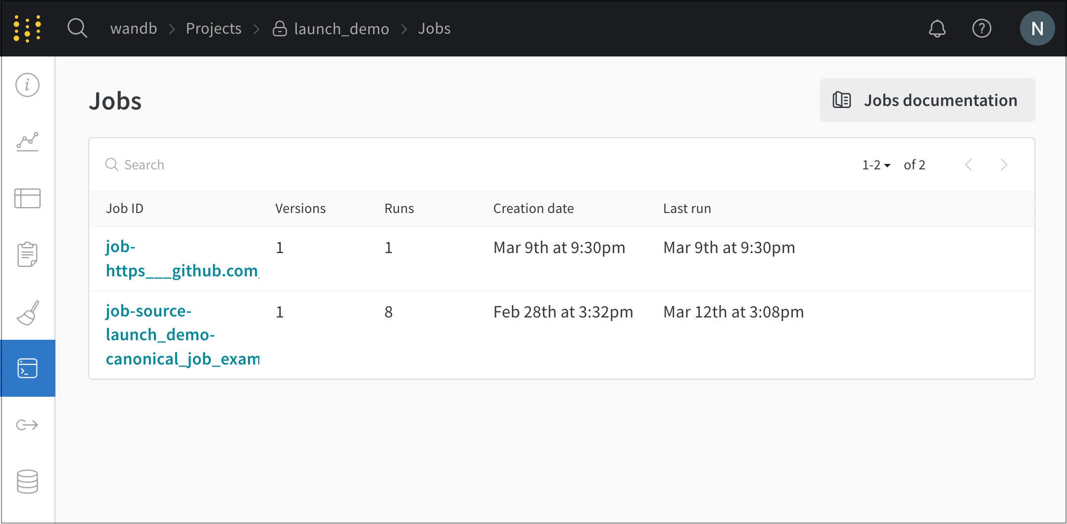 - Jobs 페이지에는 이전에 실행된 W&B run에서 생성된 W&B Launch job 목록이 표시됩니다.