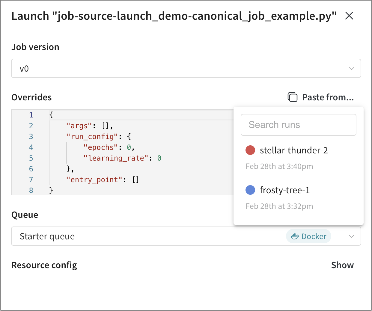 Paste from... 버튼을 클릭하여 launch job을 사용한 다른 W&B run에서 값을 복사하여 붙여넣을 수 있습니다. - Queue 드롭다운에서 launch job을 추가하려는 launch 대기열의 이름을 선택하세요.