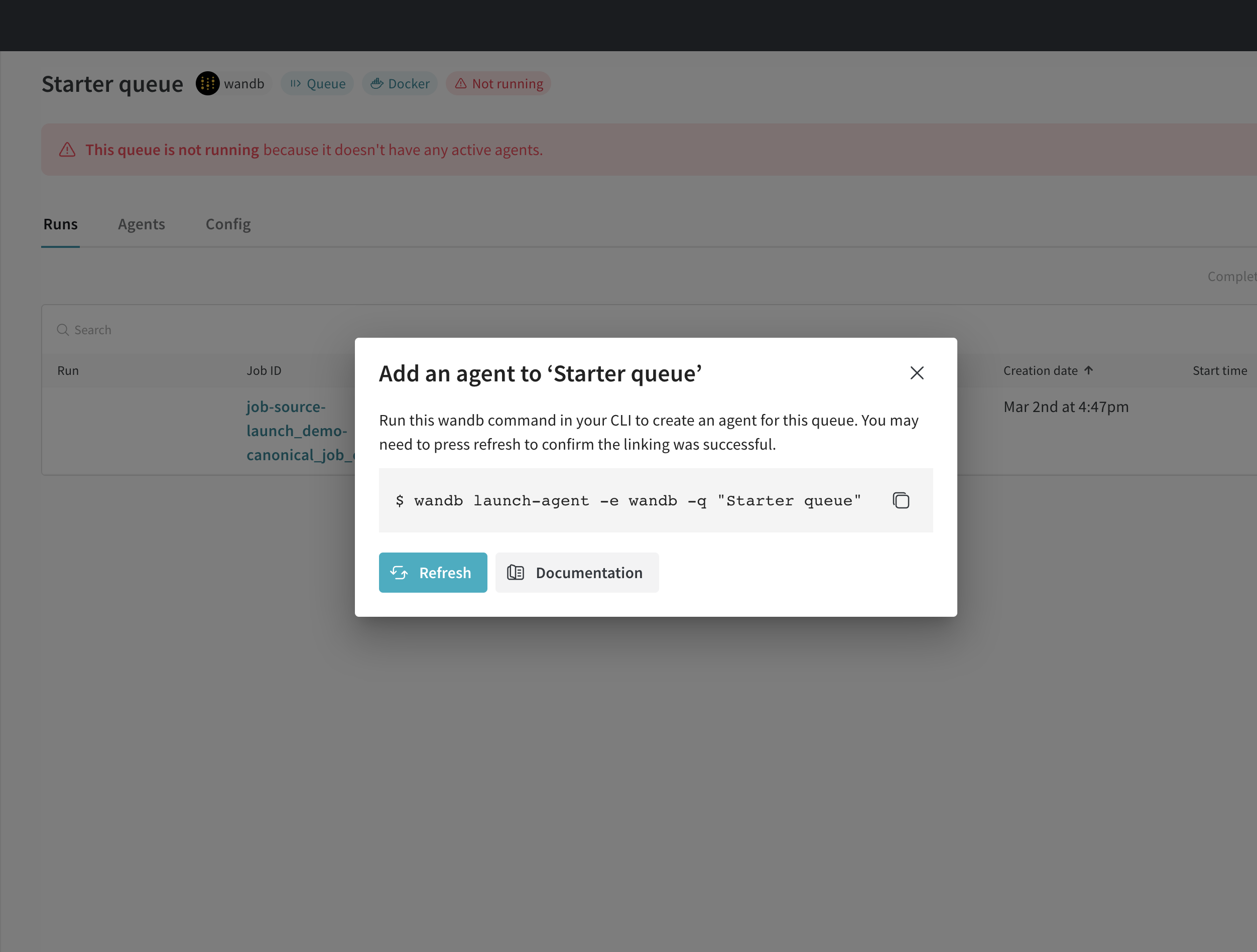 런치 작업을 실행하려면 작업이 추가된 런치 큐를 폴링할 런치 에이전트가 필요합니다. 런치 에이전트를 생성하고 시작하는 단계는 다음과 같습니다: