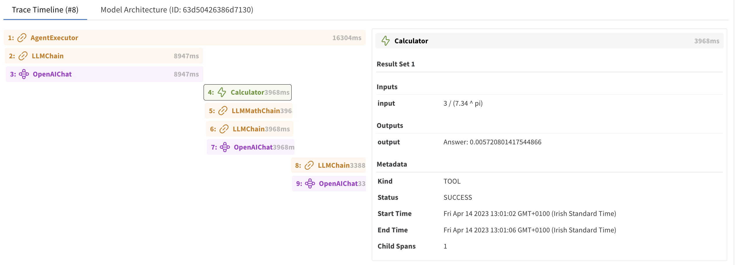 "에이전트" 실행의 각 단계에 대한 입력, 출력 및 메타데이터가 자체 span에 로깅됩니다. Span은 자식을 가질 수 있습니다.