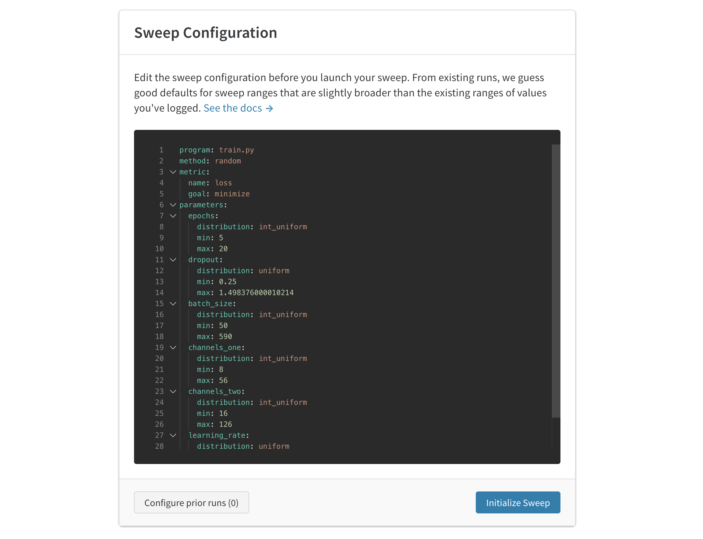 자동 생성된 설정은 완료된 run을 기반으로 스윕할 값들을 추정합니다. 설정을 편집하여 시도하고 싶은 하이퍼파라미터의 범위를 지정하세요. 스윕을 시작하면 호스티드 W&B 스윕 서버에서 새 프로세스가 시작됩니다. 이 중앙 집중식 서비스는 트레이닝 작업을 실행하는 기계인 에이전트를 조정합니다.