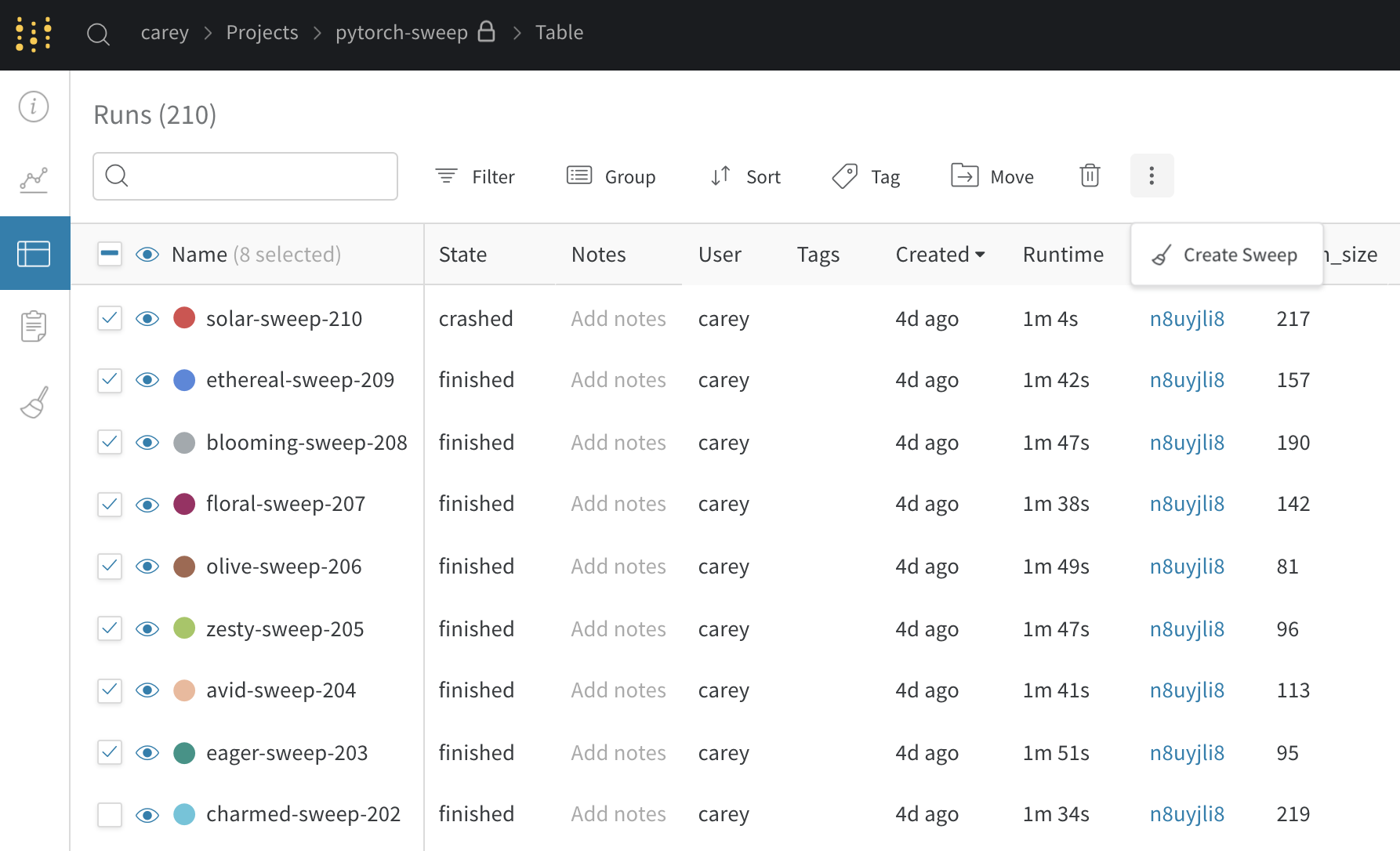 프로젝트 페이지에서 사이드바의 Sweep 탭을 열고 Create Sweep을 선택하세요.